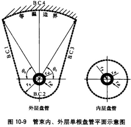 由于土壤蓄冷、釋冷的傳熱過程與地理管在管束中的位置有關,因此在建立系統(tǒng)傳熱過程的數(shù)學模型時需對內、外層盤管分別予以考慮。對應圖10-8管束的單根內、外層埋管換熱器的控制漢域及邊界如圖10-9所示.