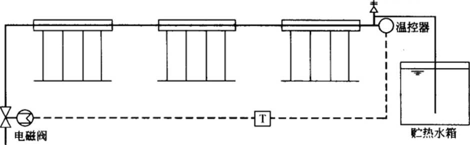 直流式系統(tǒng)是利用控制器使傳熱工質(zhì)在自來水壓力或其他附加動力作用下,直接流過集熱器加熱的系統(tǒng)(見圖4-3)。直流式系統(tǒng)一般采用變流量定溫放水的控制方式,當(dāng)集熱系統(tǒng)出水溫度達(dá)到設(shè)定溫度時,水閥打開,集熱系統(tǒng)中的熱水流人熱水貯水箱中;當(dāng)集熱系統(tǒng)出水溫度低于設(shè)定溫度時,水閥關(guān)閉,補(bǔ)充的冷水停留在集熱系統(tǒng)中吸收太陽能被加熱。直流式系統(tǒng)只能是直接式系統(tǒng),可以采用非承壓集熱器,集熱系統(tǒng)造價較低。在國內(nèi)的中小型建筑中使用較多;由于存在生活用水可能被污染、集熱器易結(jié)垢和防凍問題不易解決的缺點,國外很少使用。