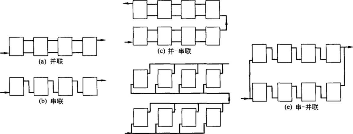 一般來說,太陽能工程集熱器連接成集熱器組的方式有三種(圖4-10):串聯(lián)、并聯(lián)和串并聯(lián),串并聯(lián)也稱之為混聯(lián)。對于自然循環(huán)的太陽能熱水工程系統(tǒng),集熱器不能串聯(lián),否則因循環(huán)流動阻力大,系統(tǒng)難以循環(huán),只能采用并聯(lián)方式,且每個集熱器組集熱器數(shù)目不宜超過16個或總面積不宜超過32m2;對于非自然循環(huán)系統(tǒng),太陽能工程集熱器可采用串并聯(lián)或并聯(lián)方式連接,但一般情況下,推薦采用并聯(lián)的方式連接,采用串聯(lián)連接時,串聯(lián)的集熱器個數(shù)也不宜超過三個。