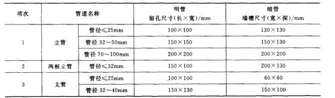 太陽能熱水管道安裝前需要預留的孔洞主要是管道穿墻和穿樓板孔洞及穿墻、穿樓板套管的安裝。一般混凝土結構上的預留孔洞由設計在結構圖上給出尺寸大小;其他結構上的孔洞,當設計無規(guī)定時應按表5-3規(guī)定預留。