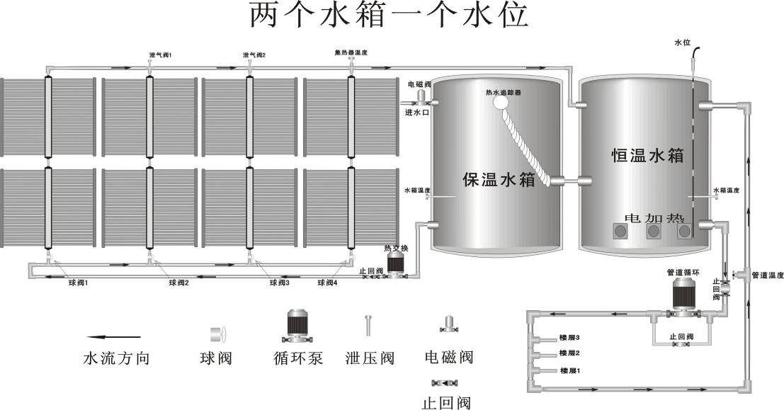 太陽能熱水器工程兩個水箱一個水位控制太陽能熱水運(yùn)行原理參照圖:
