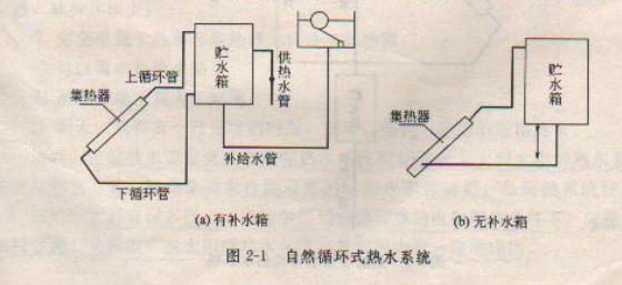 太陽能熱水器系統(tǒng)-自然循環(huán)式是利用傳熱工質(zhì)內(nèi)部的沮度梯度產(chǎn)生的密度差所形成的自然對流進(jìn)行循環(huán)的熱水系統(tǒng)。這種系統(tǒng)結(jié)構(gòu)簡單不需要附加動力,在自然循環(huán)中,為了保證必要的熱虹吸壓頭,貯水箱應(yīng)置于集熱器上方,如圖所示: