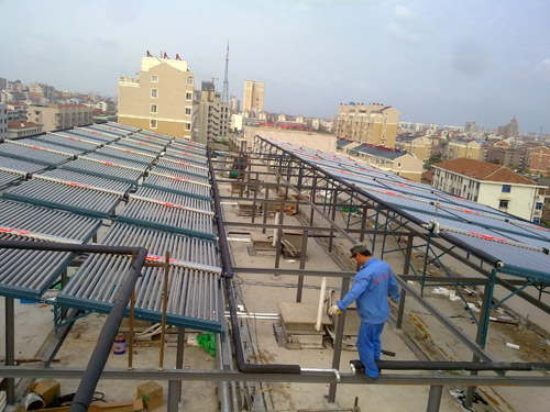 太陽(yáng)能熱水工程模塊主要是針對(duì)用熱水量比較大的用戶,一般超過(guò)三噸以上,都會(huì)用到太陽(yáng)能熱水工程模塊。常見的太陽(yáng)能熱水器工程模塊都是25一排共二排,中間是聯(lián)箱連接的,一組是50支真空管,也就是半噸水。還有一種就是單邊模塊,因?yàn)槭菑S家,我們可以就您安裝的場(chǎng)地而定制,10支工15支或20支都可以。