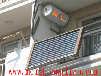 壁掛式太陽能熱水器的集熱器一般有平板與真空管二種,屬于分離式太陽能熱水系統(tǒng),水箱放置在陽臺(tái)內(nèi),集熱器放置在建筑南立面陽臺(tái)上。其工作原理為:利用集熱管將吸收的太陽輻射轉(zhuǎn)換成熱能。利用虹吸原理,熱能到達(dá)水箱與水換熱,從而使整個(gè)水箱內(nèi)的水溫逐漸升高。